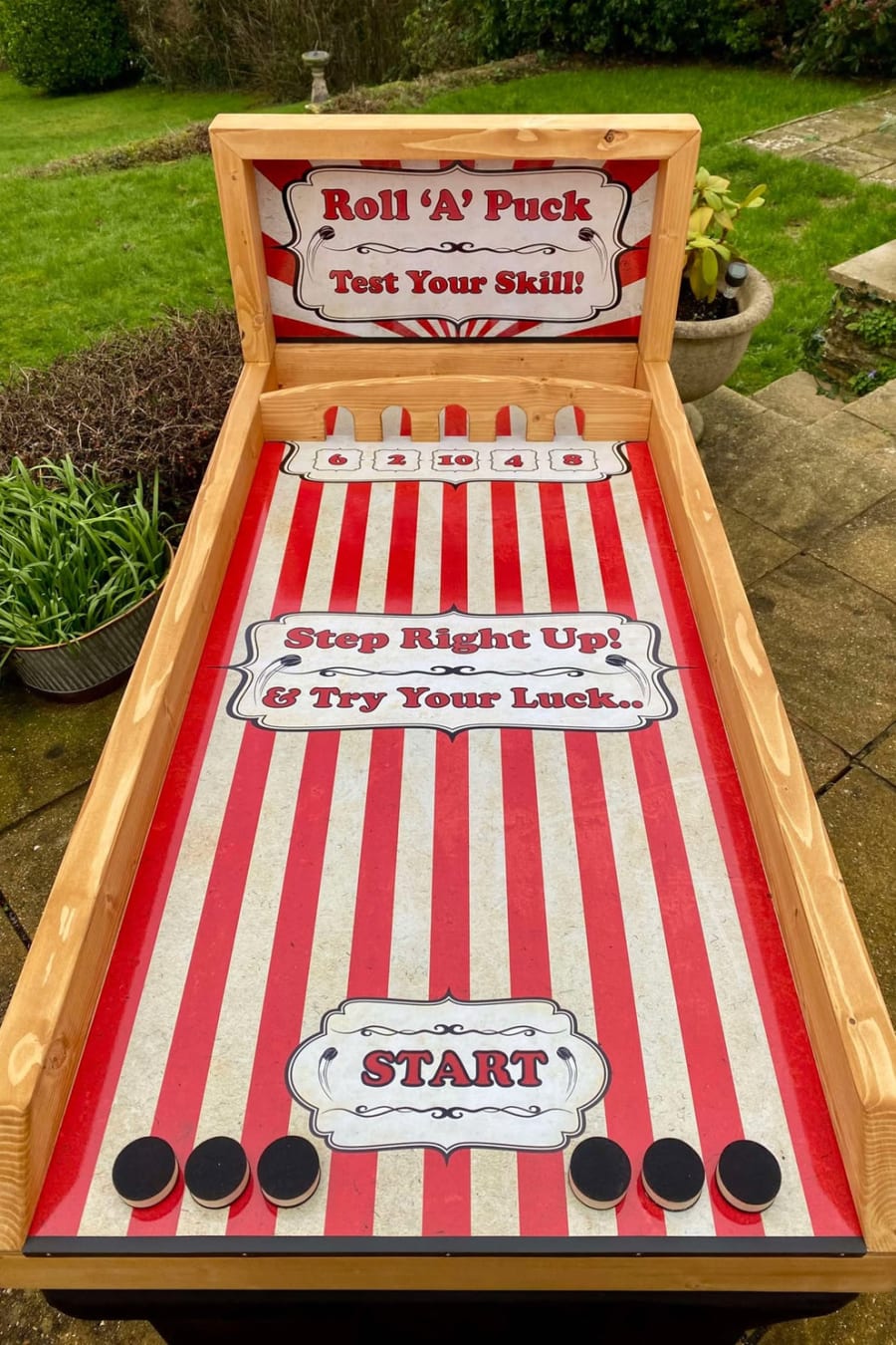 Roll A Puck is an exciting handmade wooden tabletop game that puts players’ hand-eye coordination, accuracy and a little bit of luck to the test. Simple to understand yet highly engaging, this classic carnival-style challenge is perfect for events that need quick gameplay and high participation.