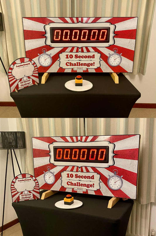 Players press the button to start the clock and attempt to stop it as close to 10.00 seconds as possible. Record the best attempt on the leaderboard and challenge others to beat it — perfect for competitions, prizes and ongoing engagement throughout your event.